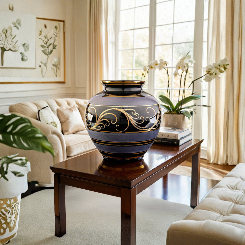 - Decor không gian sống: Với kiểu dáng chum tròn cổ điển kết hợp cùng họa tiết móc vàng sang trọng trên nền đen huyền bí, sản phẩm là điểm nhấn nghệ thuật đẳng cấp cho phòng khách, kệ sách hoặc tủ trưng bày. Màu sắc trung tính nhưng quyền quý giúp tôn lên vẻ đẹp hiện đại và tinh tế cho mọi phong cách nội thất.