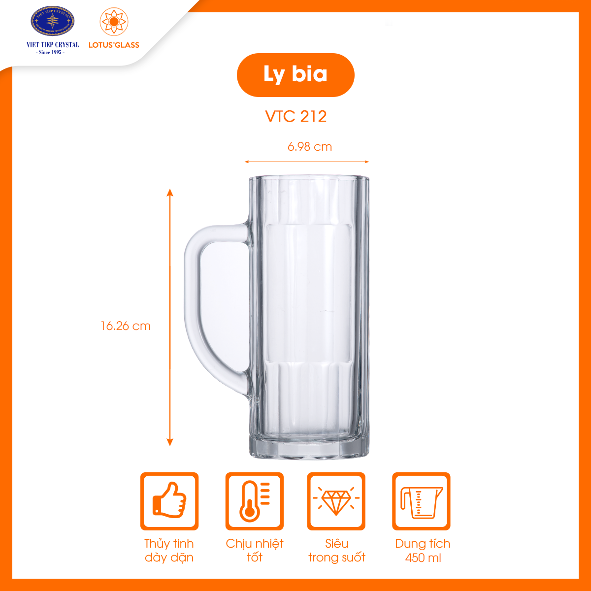 Dung tích lớn 405ml rất phù hợp sử dụng trong quán bia, nhà hàng, khách sạn hoặc các buổi tiệc gia đình. Được chế tác từ thủy tinh kiềm cao cấp, cốc VTC 212 bền chắc, an toàn sức khỏe và dễ vệ sinh, đồng thời giữ được vẻ sáng bóng lâu dài.