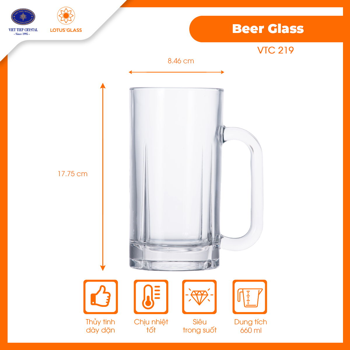 Cốc thủy tinh bia có quai VTC 219 dung tích lớn 660ml, thiết kế dáng cao, thân trơn trong suốt, quai cầm chắc chắn và bền đẹp. Đây là dòng sản phẩm cao cấp của Công ty TNHH Thủy tinh Pha lê Việt Tiệp, mang lại sự sang trọng và tiện dụng cho trải nghiệm thưởng thức bia.